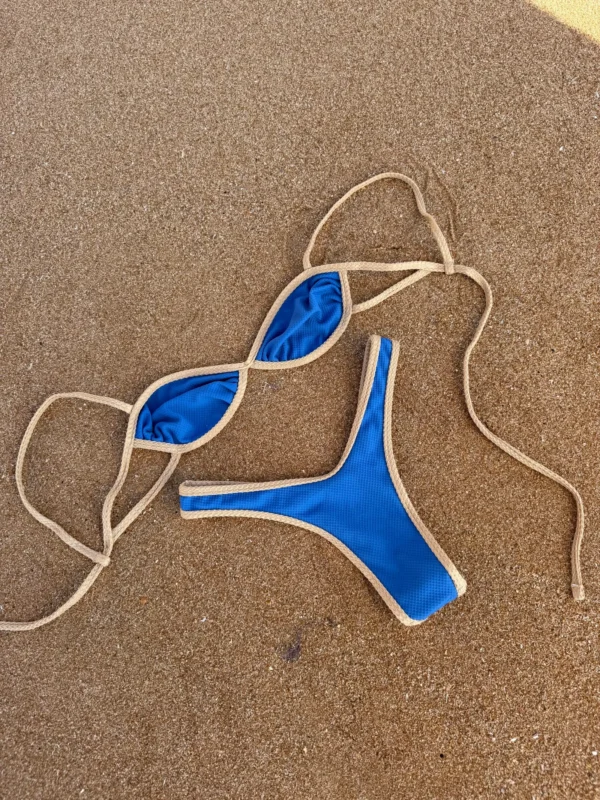 Biquíni Ana Astra Cappuccino – Nosso biquíni que exala verão, sol e liberdade. O Ana tem sutiã com casinha na alça que deixa você escolher: no ombro ou amarrado no pescoço, dois jeitos, o mesmo charme. A calcinha asa delta valoriza o corpo com recorte que alonga e segura com conforto. confeccionado em malha texturizada, toque macio e forro que não deixa entrar areia. O contraste das cores cappuccino e azul: delicado e marcante, do jeitinho que a gente gosta. Tecido com proteção UV FPU 50+