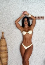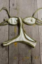Biquíni Camila Pistache – Sutiã fixo, modelo camisetinha (ombro)  e calcinha é nosso modelo Ana asa delta. Malha Carmel com textura,  nas cores pistache e off white, deixando o conjunto ainda mais lindo. A malha é super macia, com forro suplex  (não entra areia e não deixa transparente), confortável e com proteção UV FPU 50+.