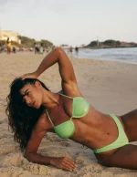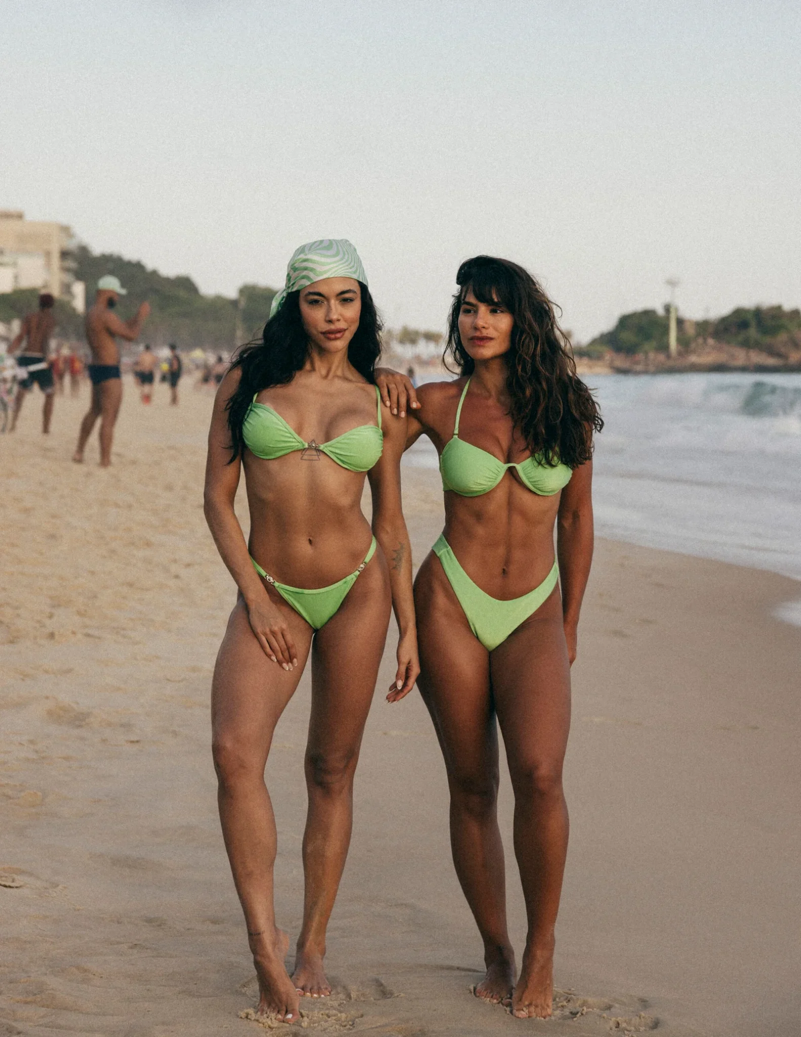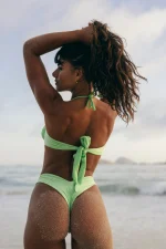 Biquíni Joana/Catarina Jade é aquele clássico com toque fresh que nunca perde o charme. O sutiã com aro inteiro valoriza o busto na medida certa e ainda te dá liberdade com as amarrações versáteis, vai do tomara que caia ao pescoço em poucos nós. A calcinha catarina é perfeita pra quem procura conforto sem abrir mão do estilo, modela o corpo e deixa um ar de elegância. Confeccionado em malha canelada com um leve acetinado, forro poliamida (não entra areia e não deixa transparente) toque macio, forro que não marca e proteção UV FPU 50+.