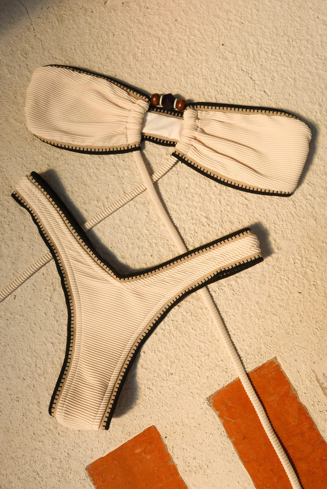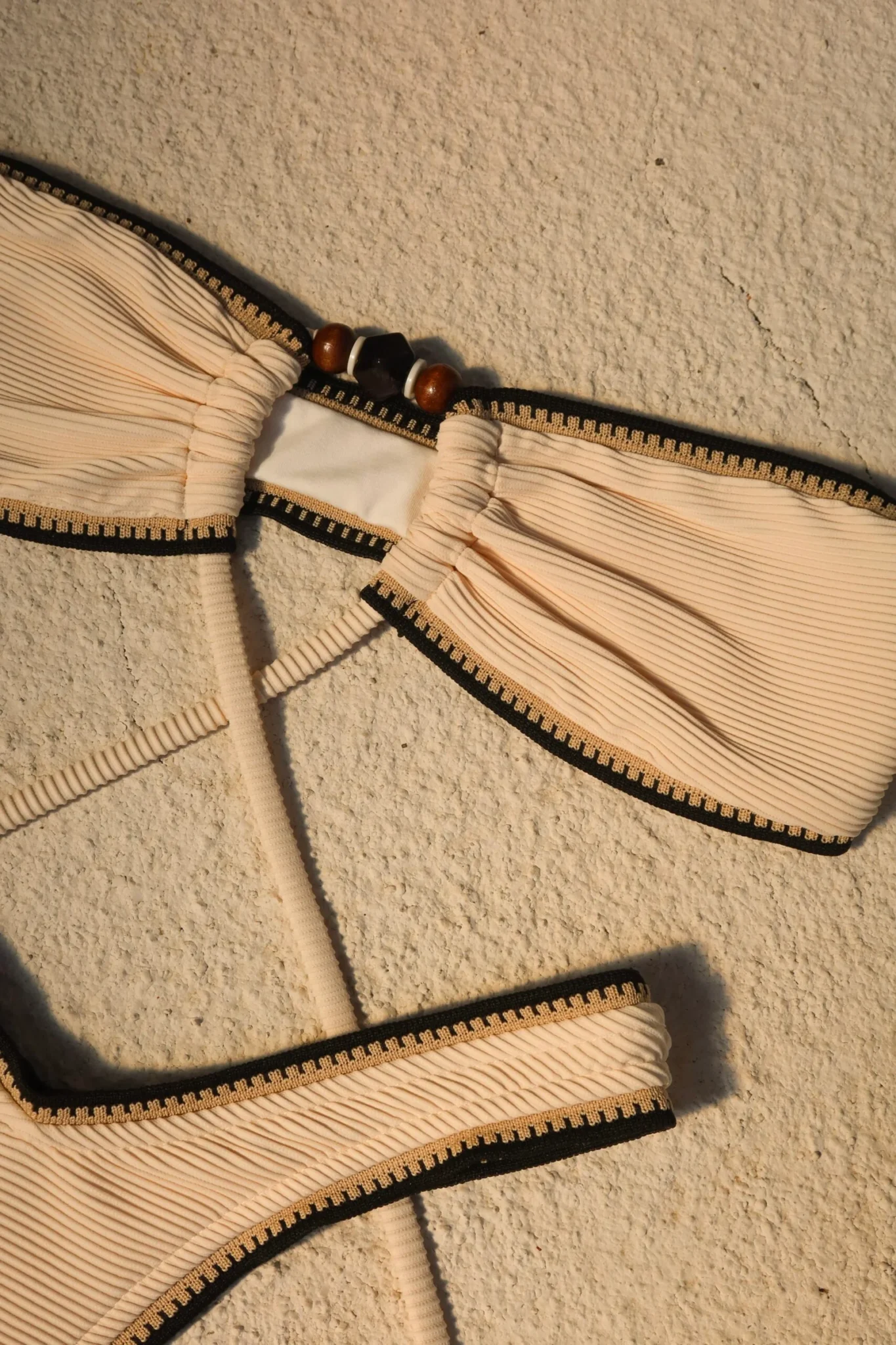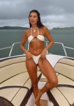 Biquíni Lolla Off White –  Nosso biquíni Lolla traz sutiã tomara que caia com rolotê e aviamentos em acrílico, permitindo diversas formas de amarração – inclusive no pescoço, pra você variar o estilo como quiser. A calcinha é asa-delta com acabamento em elástico trabalhado, realçando o visual e modelando o corpo. Confeccionado na malha canelada texturizada na cor off white. O tecido é macio, tem forro em poliamida que não retém areia, proteção UV FPU 50+ e toque super confortável.