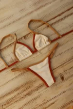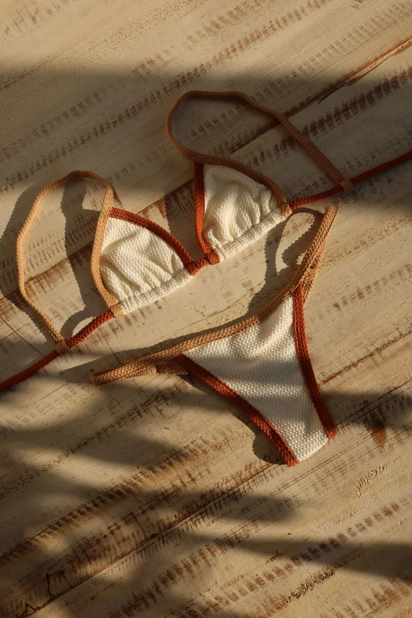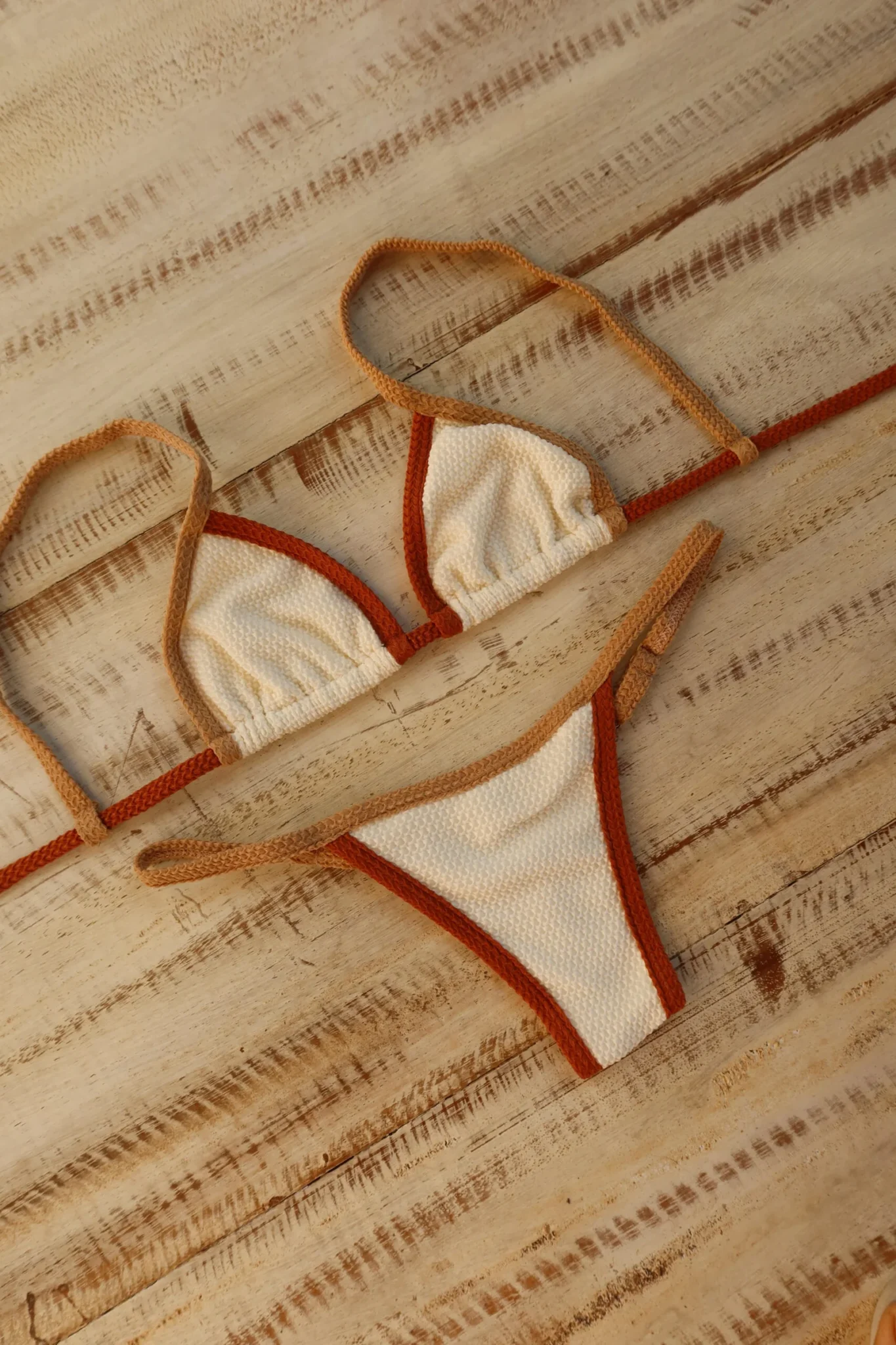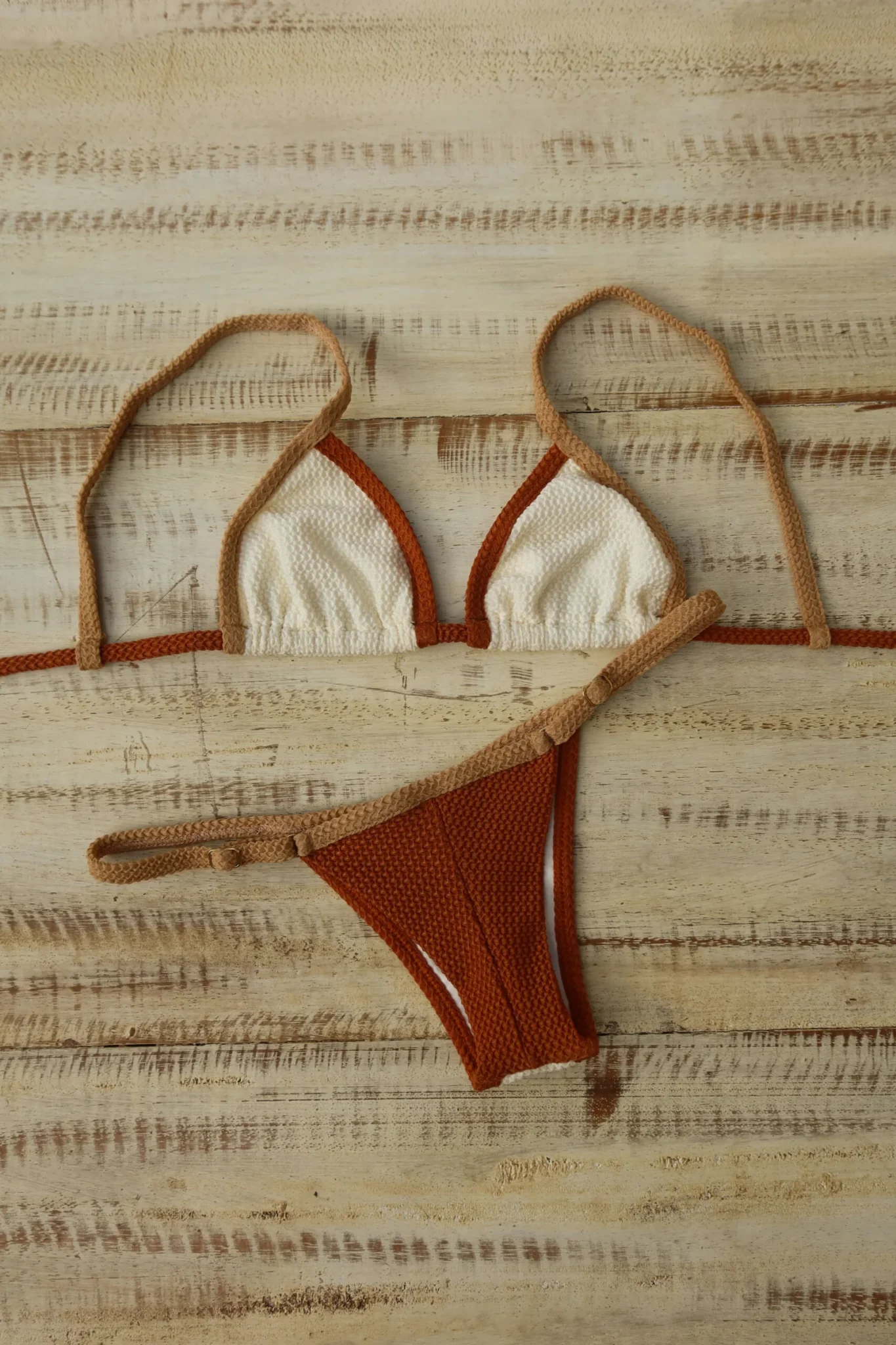 Biquíni Maysa Carmel Duna – Sutiã cortininha e casinha na alça, dando a opção de usar modelo camisetinha (ombro) ou amarrado no pescoço e calcinha com reguladores para que você possa ajustar ao quadril da forma mais confortável e bumbum fio duplo. Malha Camel com textura, na cor Carmel Duna, acabamento em viés deixando o conjunto ainda mais lindo. A malha é dupla (forrada com o mesmo tecido) super macia, confortável e com proteção UV FPU 50+.