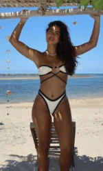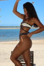 Biquíni Mia Malibu Pérola – Sutiã tomara que caia, uma modelagem versátil: rolotê com opção de diversas amarrações (podendo ser usado tomara que caia ou amarrado no pescoço) e calcinha asa-delta. Malha com textura atoalhada nas cores pérola e preto, aviamentos em acrílico no centro do busto deixando mais sofisticado e acabamento em viés que faz o conjunto ser ainda mais lindo. A malha é super macia, com forro suplex (não entra areia), confortável e com proteção UV FPU 50+.