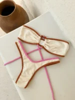 Biquíni Milla Off White – Top tomara que caia, rolotê com opção de diversas amarrações e aviamento em acrílico e calcinha asa-delta (nosso modelo Ana). Confeccionado na Malha Carmel, com textura dando um aspecto artesanal na cor off white, milk shake e mel, acabamento em viés do próprio tecido, as tiras de viés permitem que o biquíni se ajuste ao corpo perfeitamente, deixando o conjunto ainda mais lindo. A malha é super macia, confortável e com proteção UV FPU 50+.