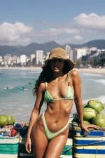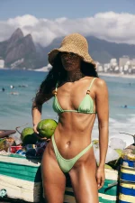 Biquíni Luma Jade – Minimalista, e com aquele toque a mais que transforma o básico em desejo. O Luma é aquele biquíni básico curinga que valoriza o corpo com sofisticação e conforto. O sutiã tem um recorte que realça os seios de forma natural e detalhe de casinha nas alças, pra você escolher entre amarração clássica no pescoço ou estilo camisetinha nos ombros, no centro, um aviamento exclusivo em cor prata que traz um charme essencial e toque perfeito ao biquíni. calcinha com reguladores para que você possa ajustar ao quadril da forma mais confortável e bumbum fio duplo. Confeccionado em malha canelada acetinada, forro poliamida (não entra areia e não deixa transparente) toque macio, forro que não marca e proteção UV FPU 50+.