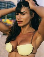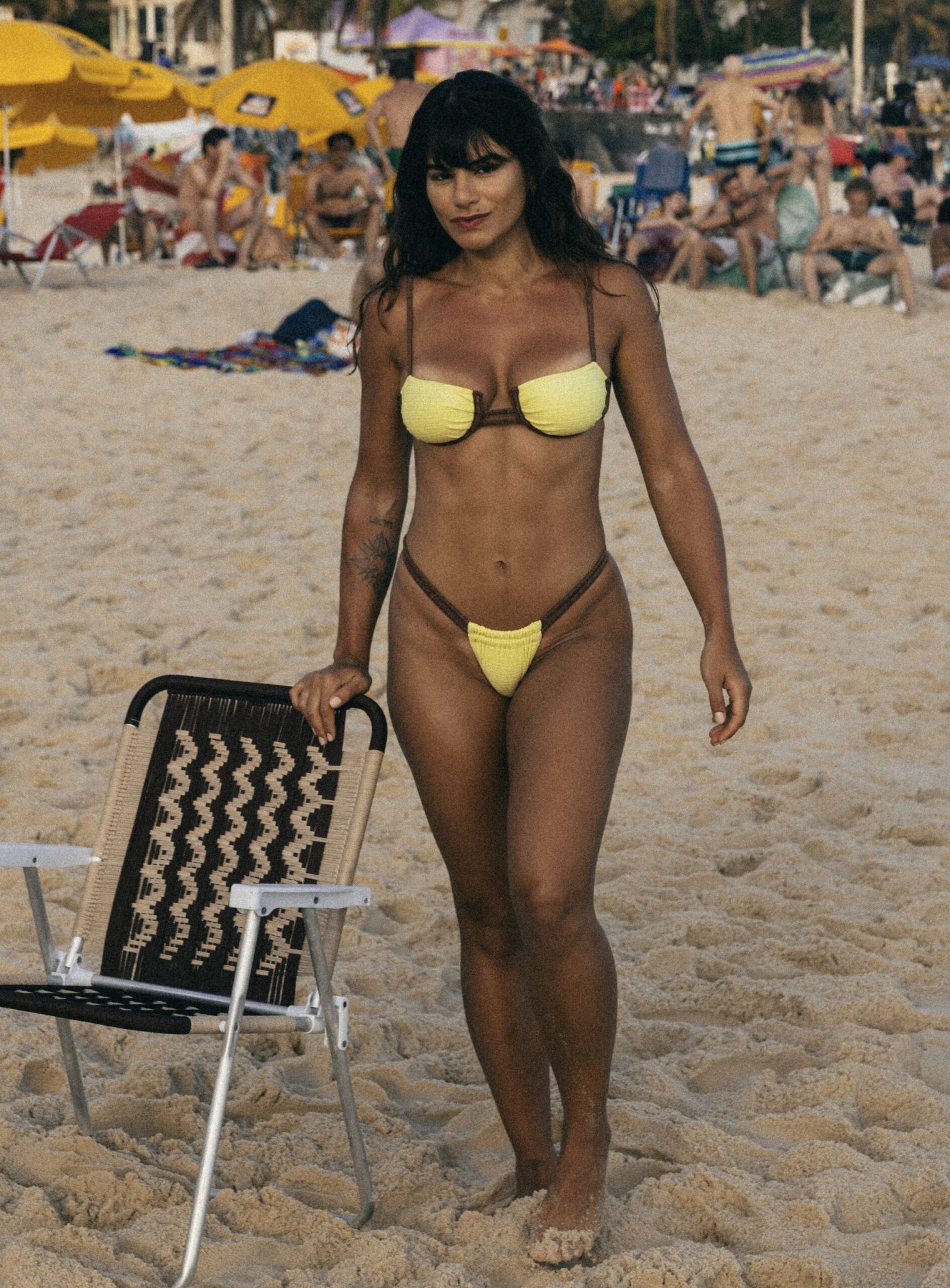 Biquíni Tay Tay/Bella Astra Lima – Sutiã meia-taça com aro, as alças tem regulagem banhada a ouro, e a amarração nas costas garante melhor ajuste ao corpo, casinha na alça permitindo amarração no pescoço ou nos ombros (estilo camisetinha). A calcinha cortininha com rolotê duplo valoriza a cintura com charme e segurança. Confeccionado em malha texturiza nas cores lima e cappuccino, esse conjunto é finalizado com costura pespontada em zig-zag, um detalhe ideal. A malha tem toque super macio, forro em poliamida (não entra areia). Com proteção UV FPU 50+