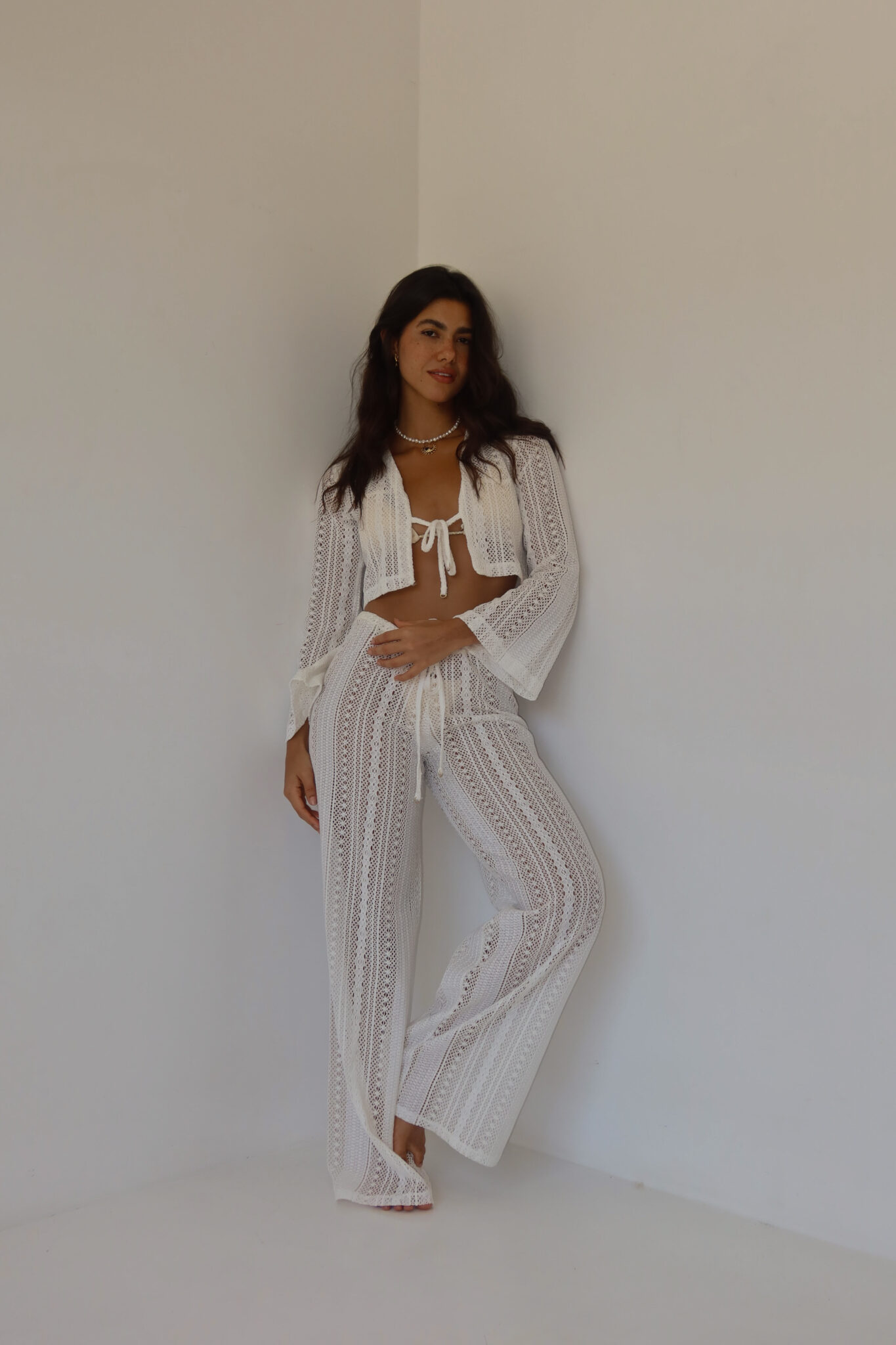 Calça pantalona, com amarração frontal e ponteira, feita em algodão, renda delicada. Perfeita para compor o look com visual praiano e chic.