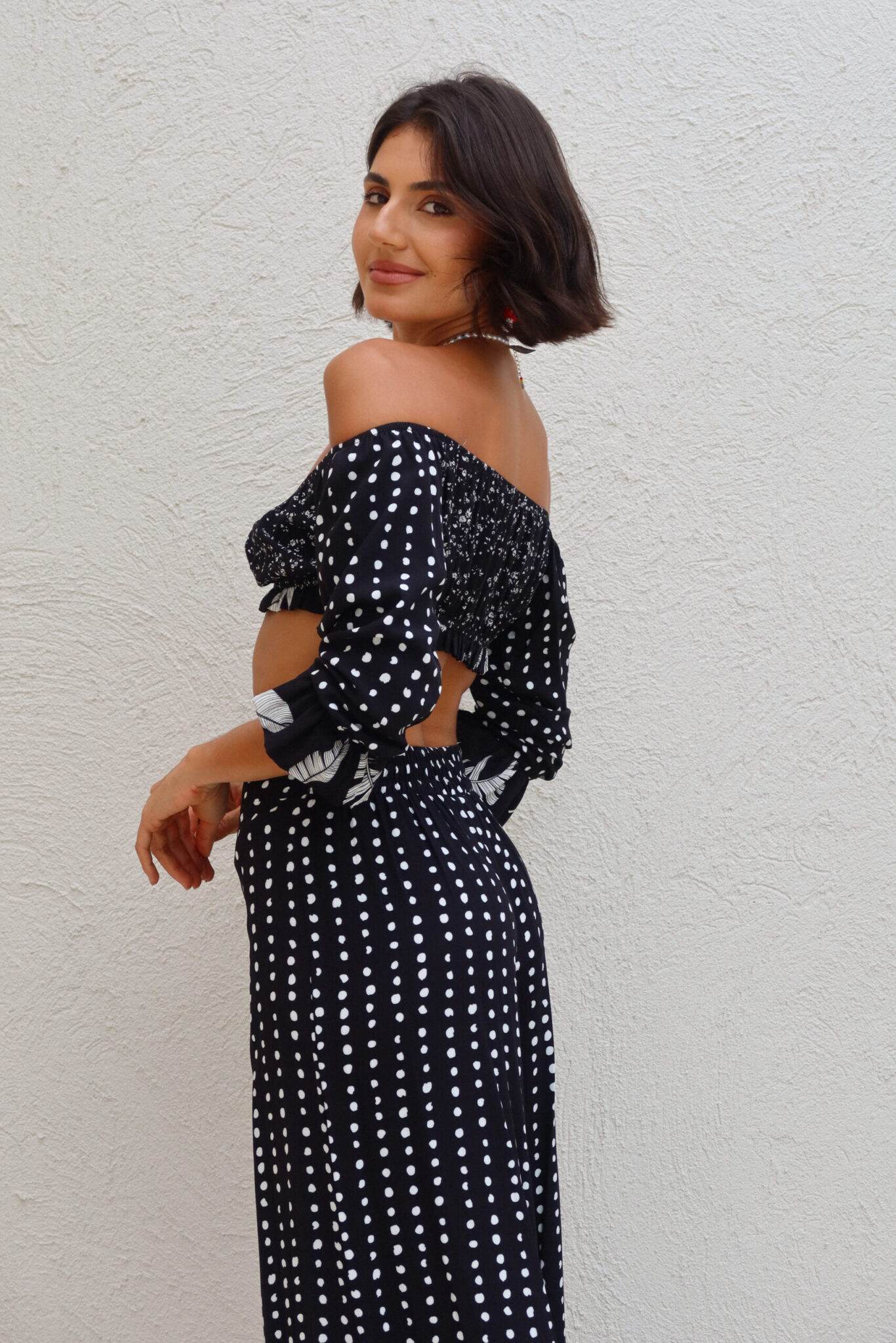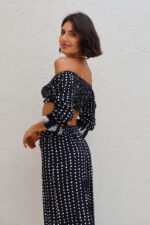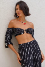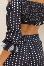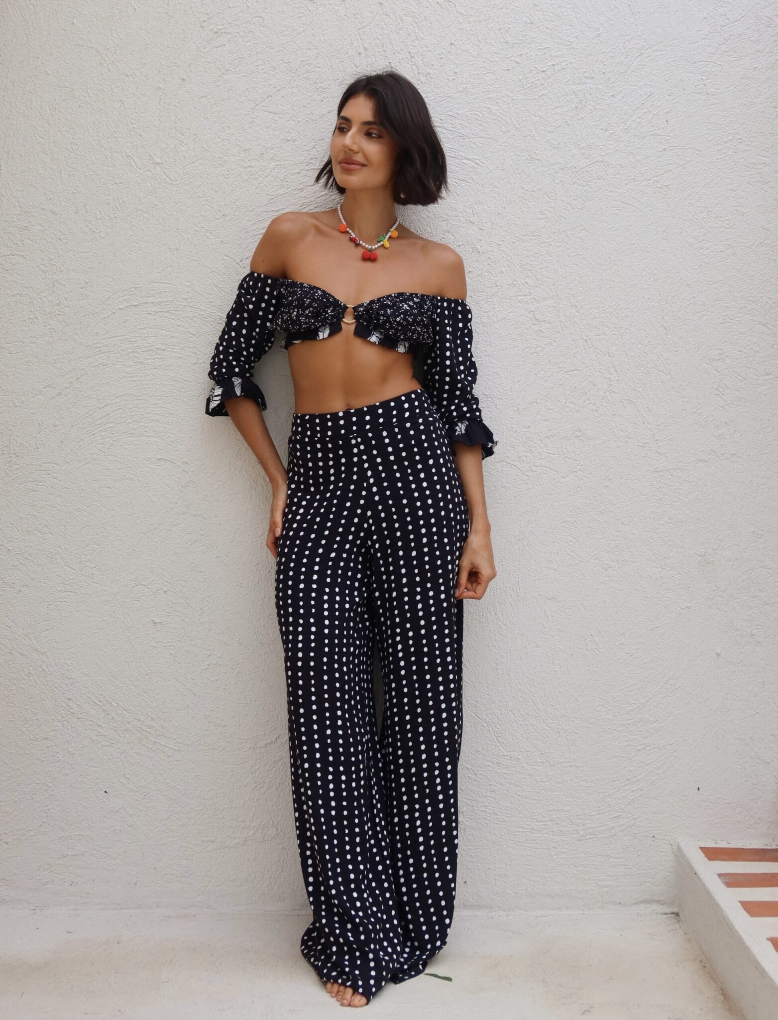 Calça de modelagem pantalona, com caimento fluido e cintura alta. Tecido em viscose leve com estampa Poá. Possui cós reto, com elástico atrás, ajustando a peça ao corpo, além de trazer um caimento super leve. Pensa em um look elegante, tropical e fresco.