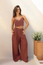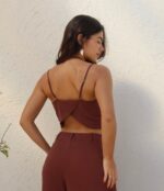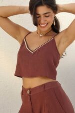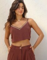 Cropped Sara Chocolate – O Cropped Sara é leve, fresco e cheio de charme. Com alcinhas finas e decote em V, ele traz um detalhe em contraste que dá um toque discreto, mas que faz a diferença. O tecido tem toque macio e um caimento que funciona bem tanto em looks mais relax quanto quando você quer um look mais elaborado. A parte de trás tem um recorte diferente, que dá personalidade e deixa o visual interessante de todos os ângulos. Ele é básico na medida, com um toque moderno que vai bem em várias ocasiões.