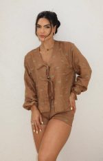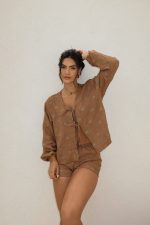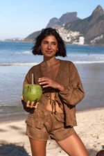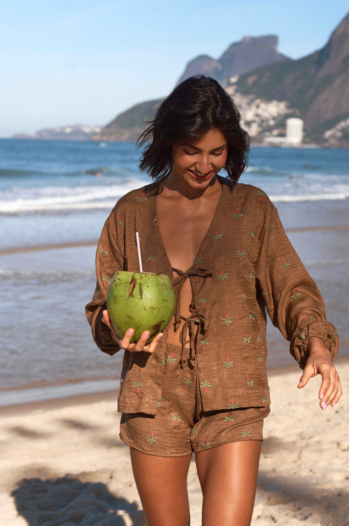 Confeccionado em viscose, ele oferece um toque macio e confortável, perfeito para os dias quentes. O destaque vem nos bordados de coqueiros, que trazem delicadeza e um ar tropical à peça.