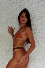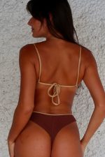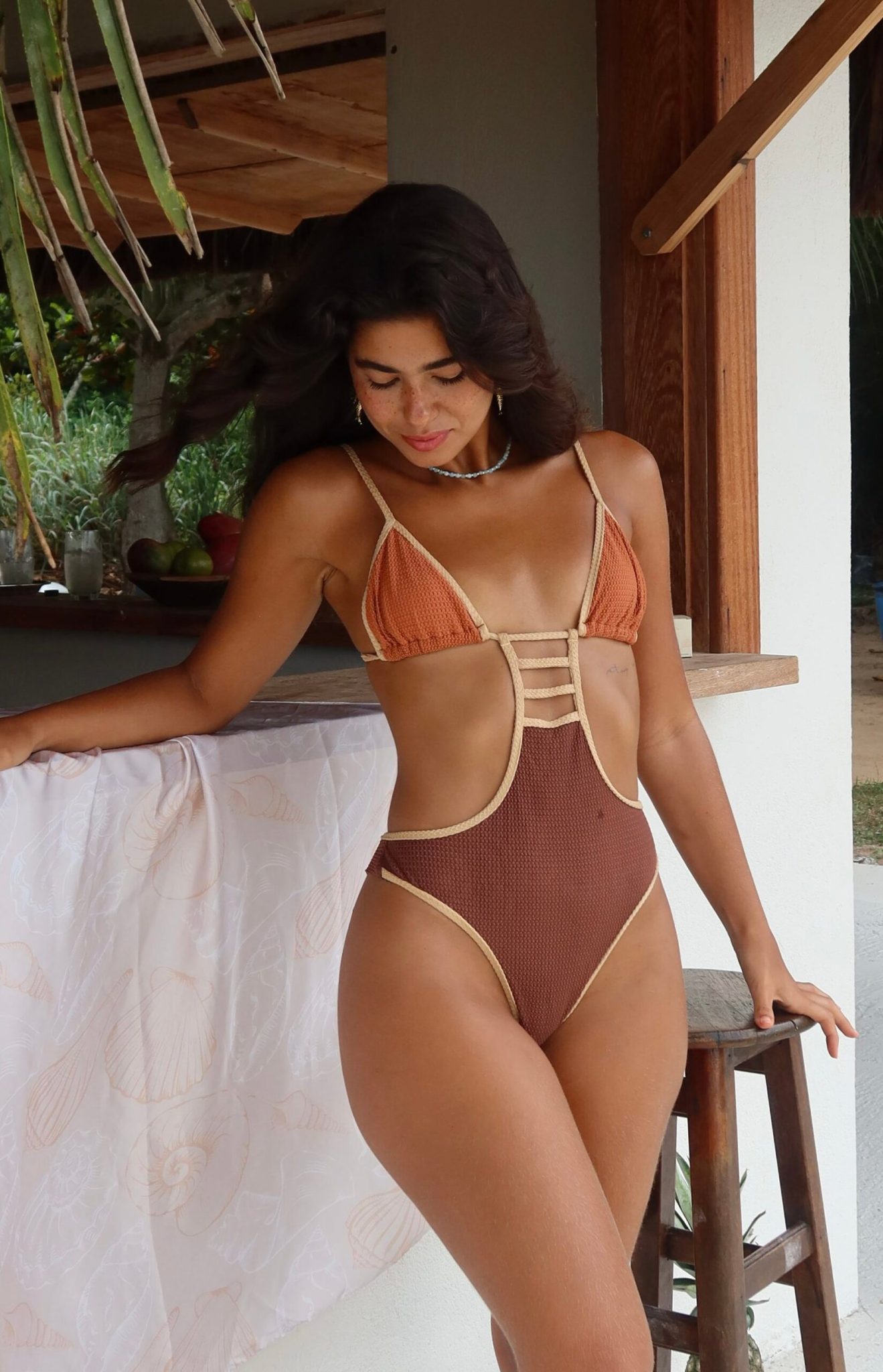 Maiô Nanda Capuccino – Modelagem cortininha com amarração nas costas e bumbum fio duplo que valoriza sem marcar. O destaque fica para o recorte frontal com tiras finas, que desenha o corpo e dá um toque super moderno à peça.
