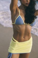 Saia Anne – Modelo curta, ajustada com franzido lateral regulável, confeccionada em malha com elastano. Possui modelagem justa ao corpo, cós baixo e detalhe de cordão para amarração na lateral.