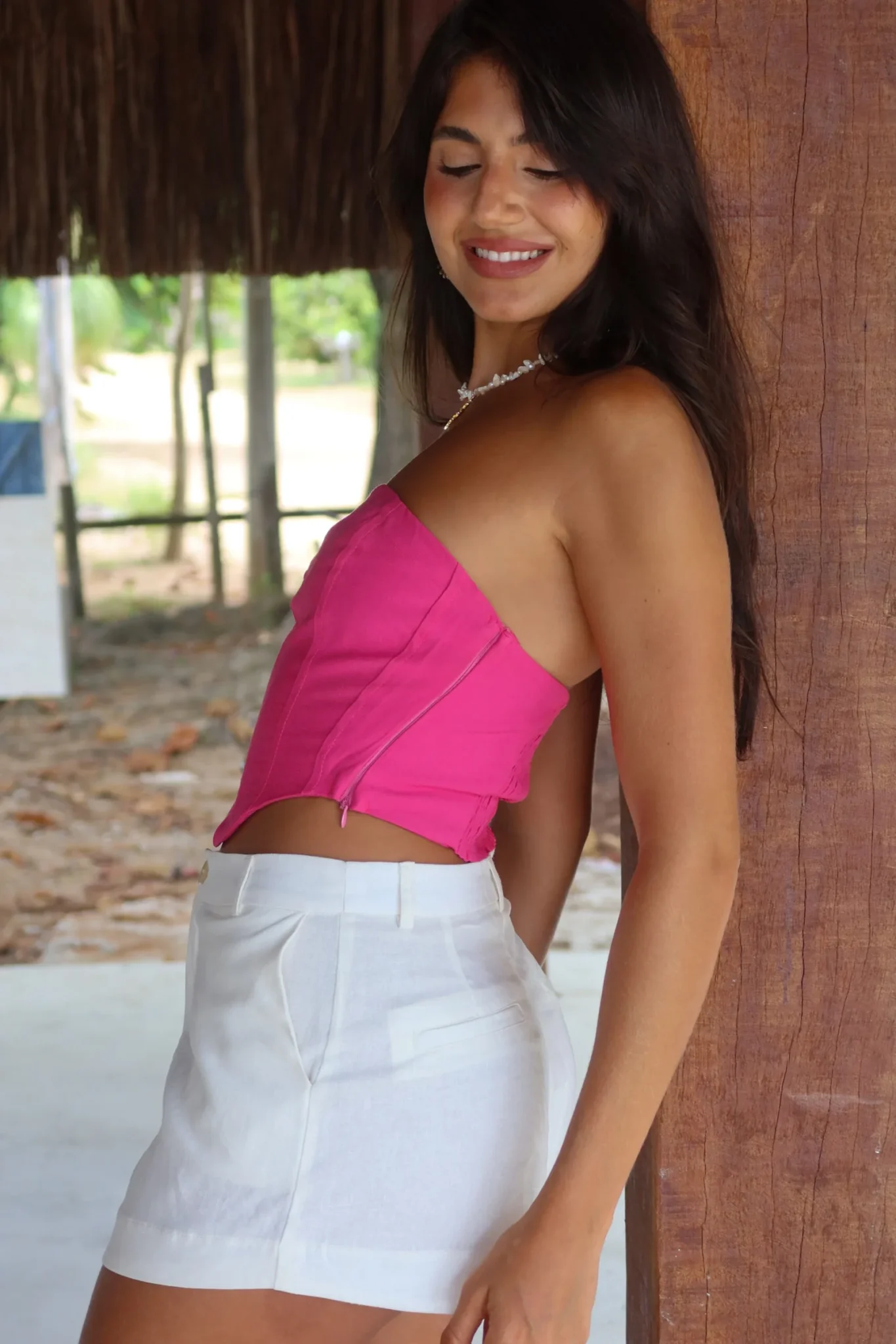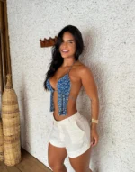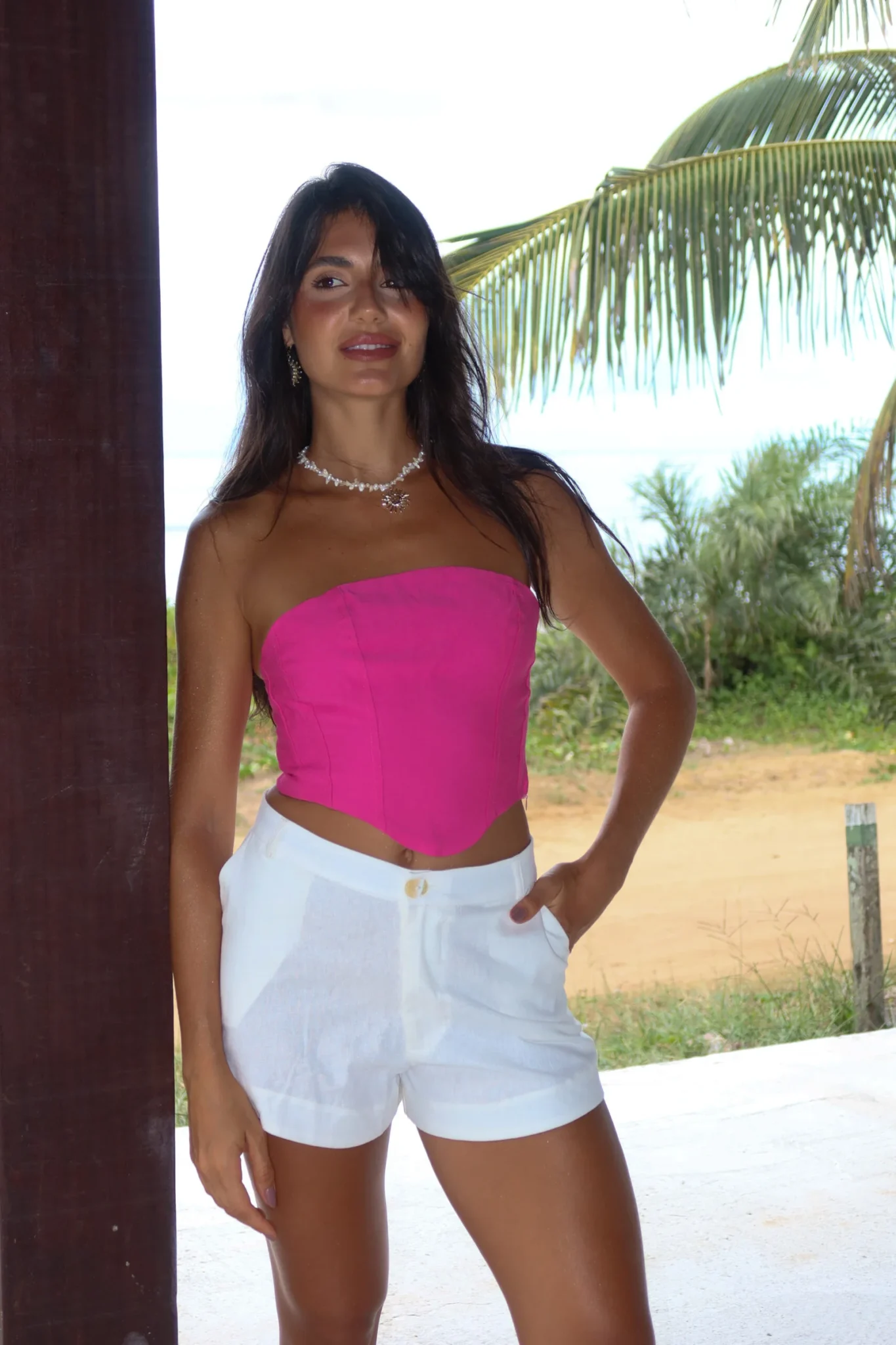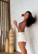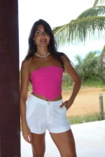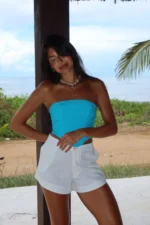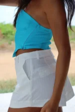 Short Isis Off White – Possui bolso faca na lateral, zíper e botão. Tecido Mix de Linho. Modelo veste P.